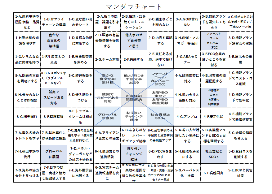 この出来上がったマンダラチャートの各々のマスに番地付けをしました。今取り組んでいる案件は果たしてどの番地を意識してやっているのか?また個々のワークや商談はどの番地を意識してやっているのかをメモすることにしました。そして必ず2つ以上の番地を記入してもらいます。その意図はすべての行動はこれに基づき実行しているということ、マンダラチャートを作って終わりではなく日々活用していくことにあります。どのような結果になるのか?とても楽しみです。