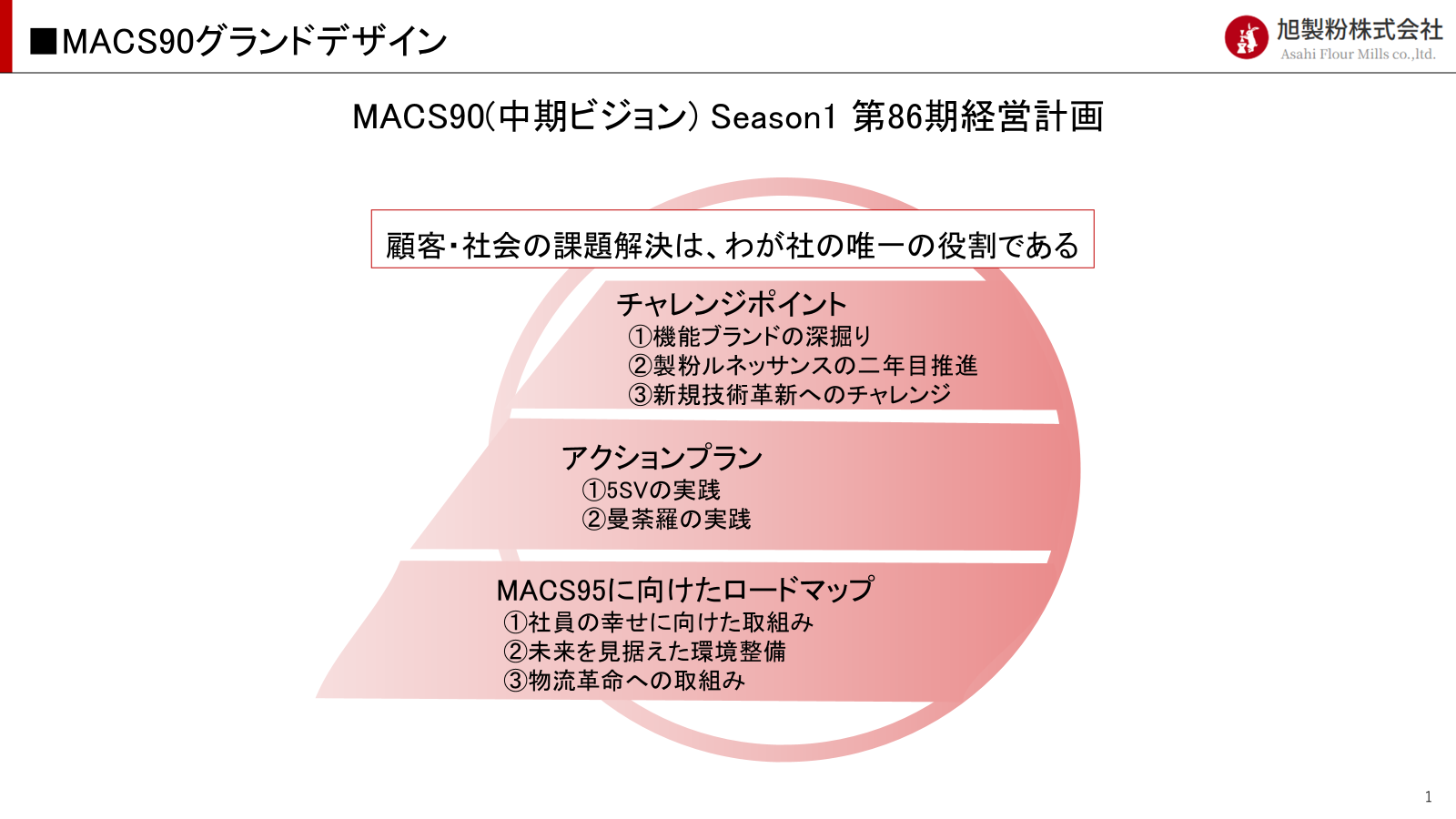 10月に入り第86期がスタートしました。昨年でMACS85(5カ年計画)が終了しました。40億から50億台へと売上が伸長した5年間でした。これは多くのお客様と新たなお取組ができた賜物です。しかしながら小麦原料の高騰、諸経費の高騰等、厳しい経営環境であったと思います。今回制定したMACS90はこれからの5年間をどのようにするのかを制定したのもです。皆さまの御理解をいただけましたら幸いです。よろしくお願いいたします。